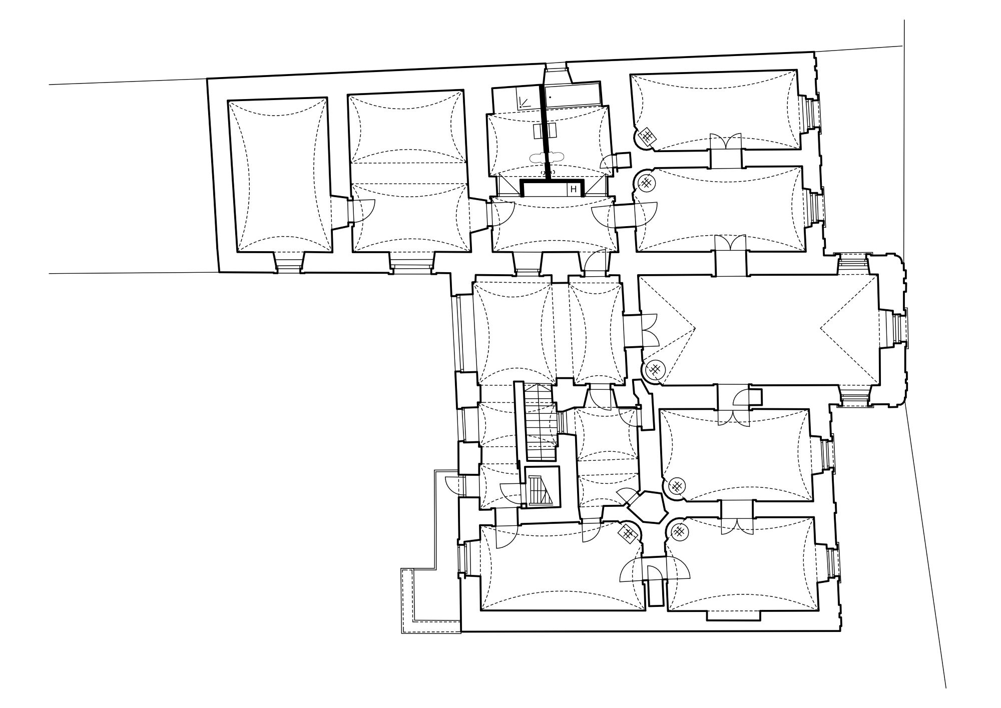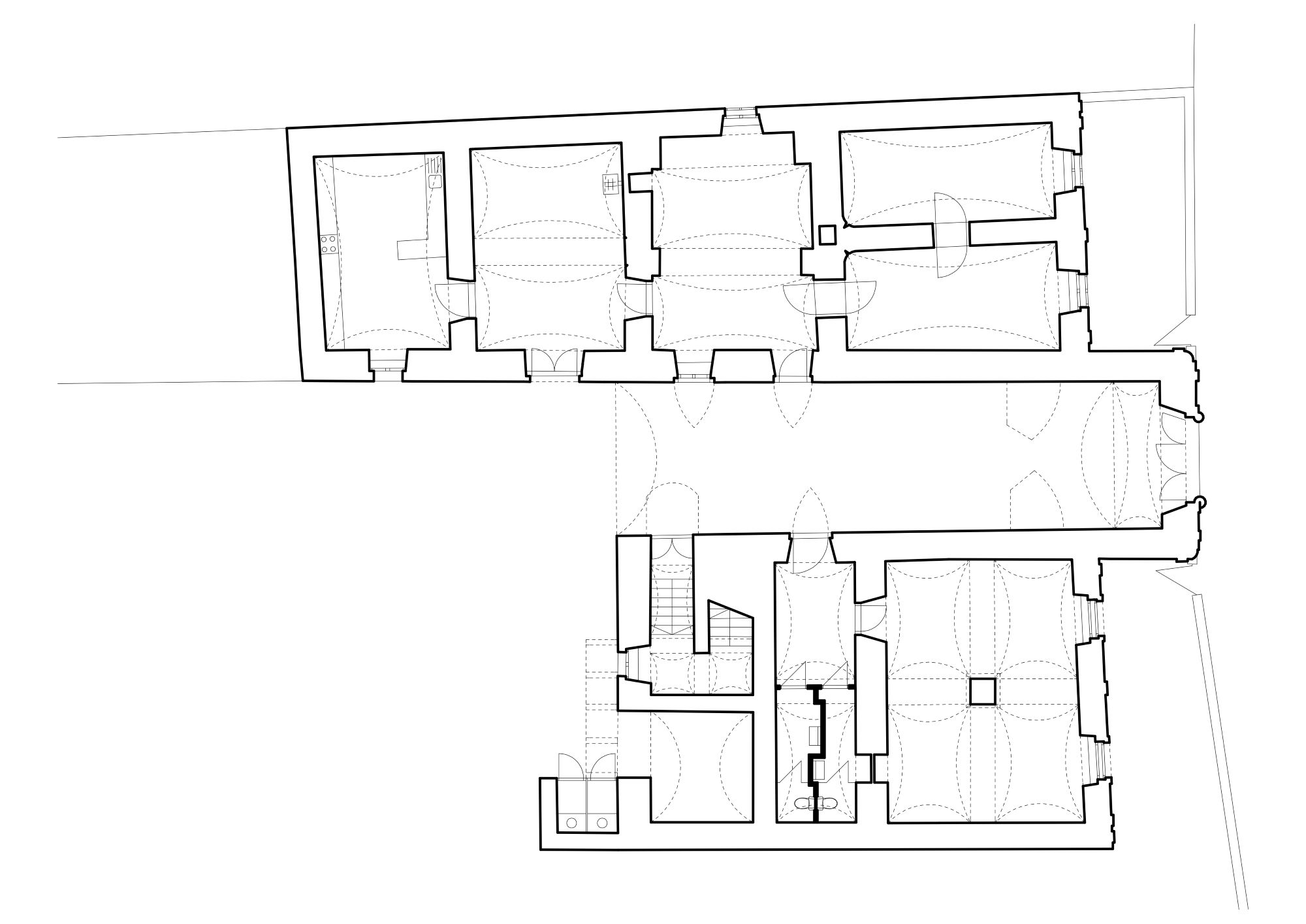 A kúria térszervezése, alaprajzi rendszere alapján feltételezhető, hogy volt egy korai, földszintes periódusa, amikor két különálló részből állt az épület: egy klasszikus, de nagy méretű háromosztatú lakóházból és egy hatosztású, egyterű gazdasági épületből.